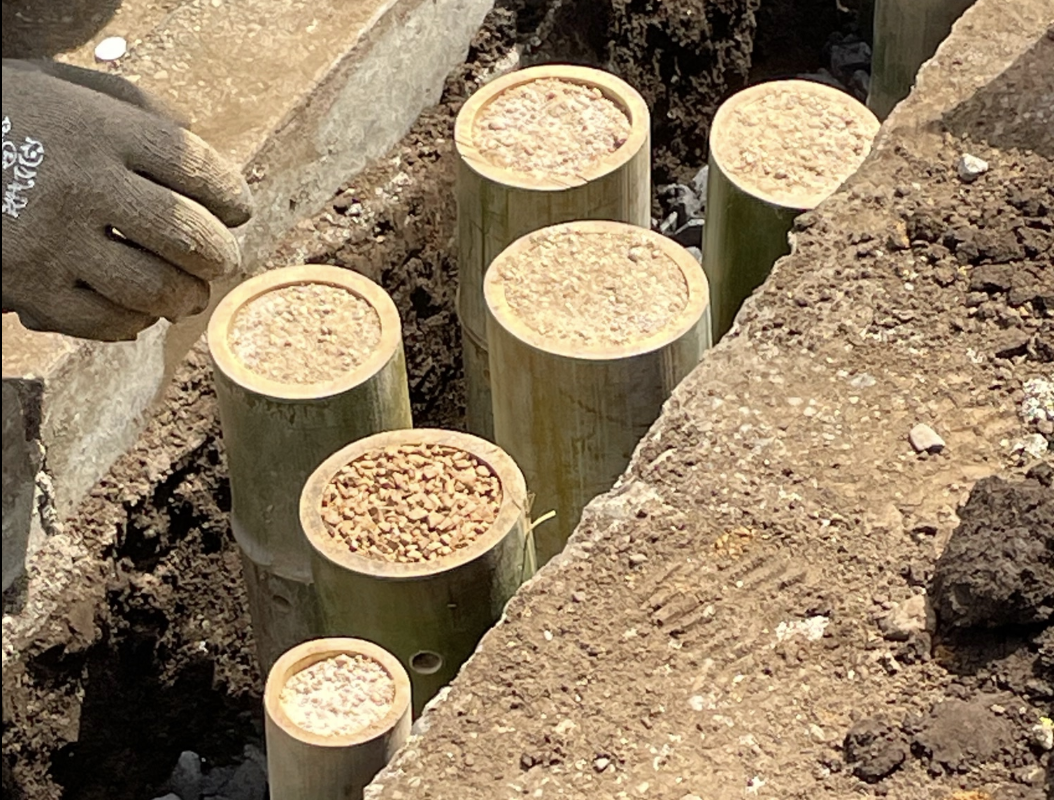世田谷の竹を使って作った浸透筒を50本並べています。